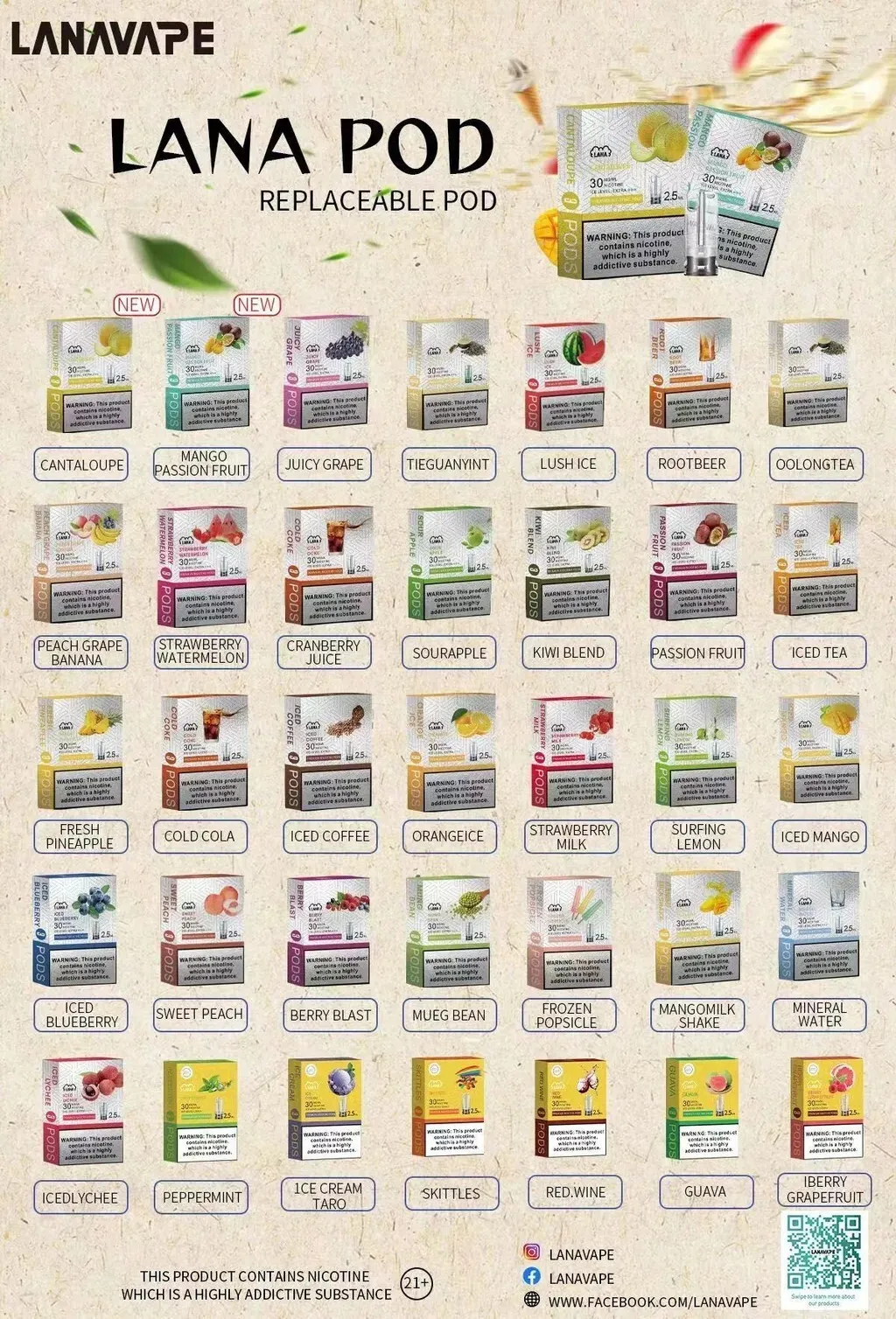 LANA 1代煙彈,2.5mL 容量,35 種口味,3% 尼古丁,透明設計帶隨機 LED 燈,通用一代